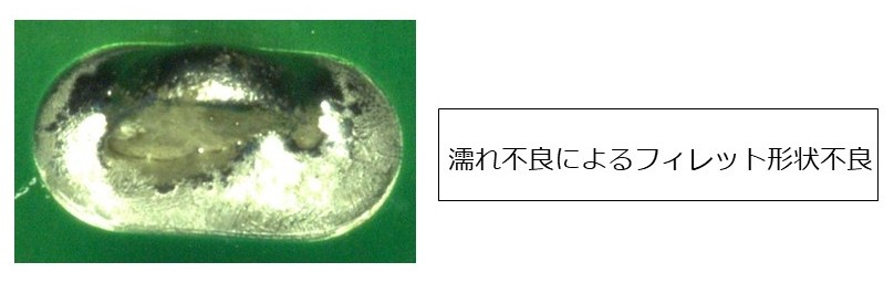 ①電子部品リードの濡れ不良:リン青銅端子材質などでSnめっき皮膜が薄く長期保存により酸化劣化し不濡れとなる場合があります。主にリード部にはんだ不濡れが生じてフィレット形成不良になります。