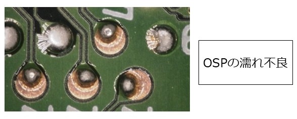 ②OSP基板の濡れ不良:ペースト印刷を失敗して溶剤で拭き取り後、OSP被膜が除去され銅箔が酸化して再印刷リフロー時に濡れ不良となる場合があります。