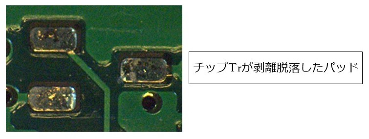 リフローはんだ付け後には問題ないように見えるが、製品として組み込んでから使用時のちょっとした衝撃などによりチップ部品が剥離&落下する場合があります。原因は、一見、良くはんだが付いている様には見えるが金めっき基板特有な接合不良です。金めっき基板では表面の金被膜がはんだ付け時にはんだ中へ拡散消失し、下地のNiめっき層とはんだが合金層を形成し接合が完了します。基板製造プロセス(Ni-Auめっき)において何らかの異常(Ni被膜の汚れ、酸化など)が発生するとはんだ付け時に良好な接合が出来なくなります。パッド接合面が黒く変質してはんだが弾く状態になり「ブラックパッド」と言われる不良です。
